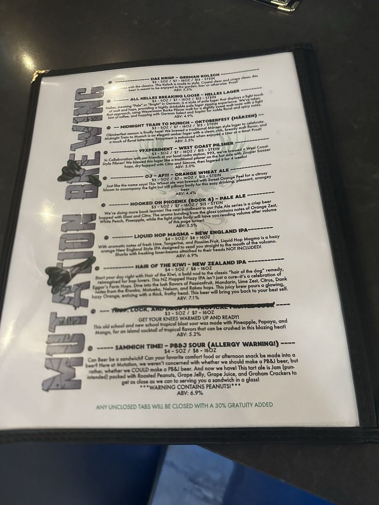 Mutation Brewing Company in Sandy Springs, GA is a Latinx-owned venue with a diverse menu and welcoming atmosphere. Offering takeout, delivery, catering, and happy hour specials, this brewery is known for its beer and wine selection. The outdoor seating is heated and covered, making it a great spot for any weather. The menu features a variety of dishes that cater to different tastes, ensuring there is something for everyone. With free Wi-Fi, TV, and dog-friendly policy, Mutation Brewing Company is a favorite spot for locals and visitors alike. Whether you're looking to enjoy a cold brew or sample their delicious dishes, this venue has something for everyone to enjoy.